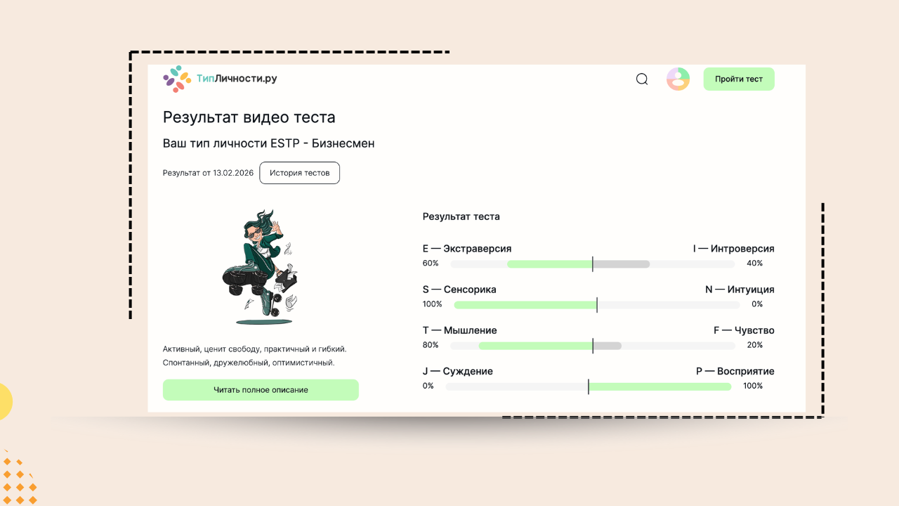 - Типируется как Extravert в MBTI - получает энергию от взаимодействия с людьми.